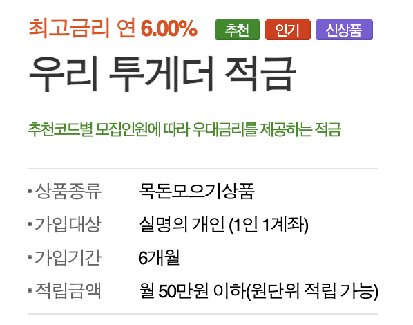 오늘은 재테크에 관심 있는 모든 분들께 좋은 소식을 전하려 합니다. 여러분의 시드머니를 효율적으로 모으고 불릴 수 있는 고금리의 적금 상품인 '우리 투게더 적금'에 대해 소개하고자 합니다.
